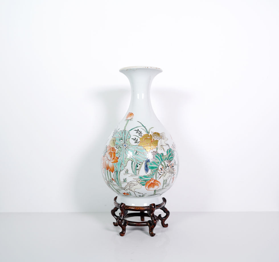 A Famille Verte 'Lotus Pond' Bottle Vase with a Wooden Stand and a Box